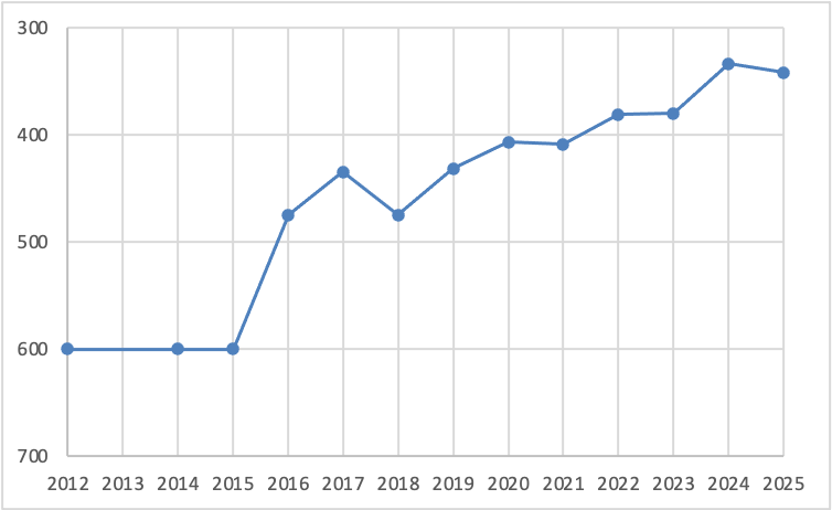 The changes in the world position of Sharif University of Technology in the QS ranking is shown in the graph below from 2012 to 2025.