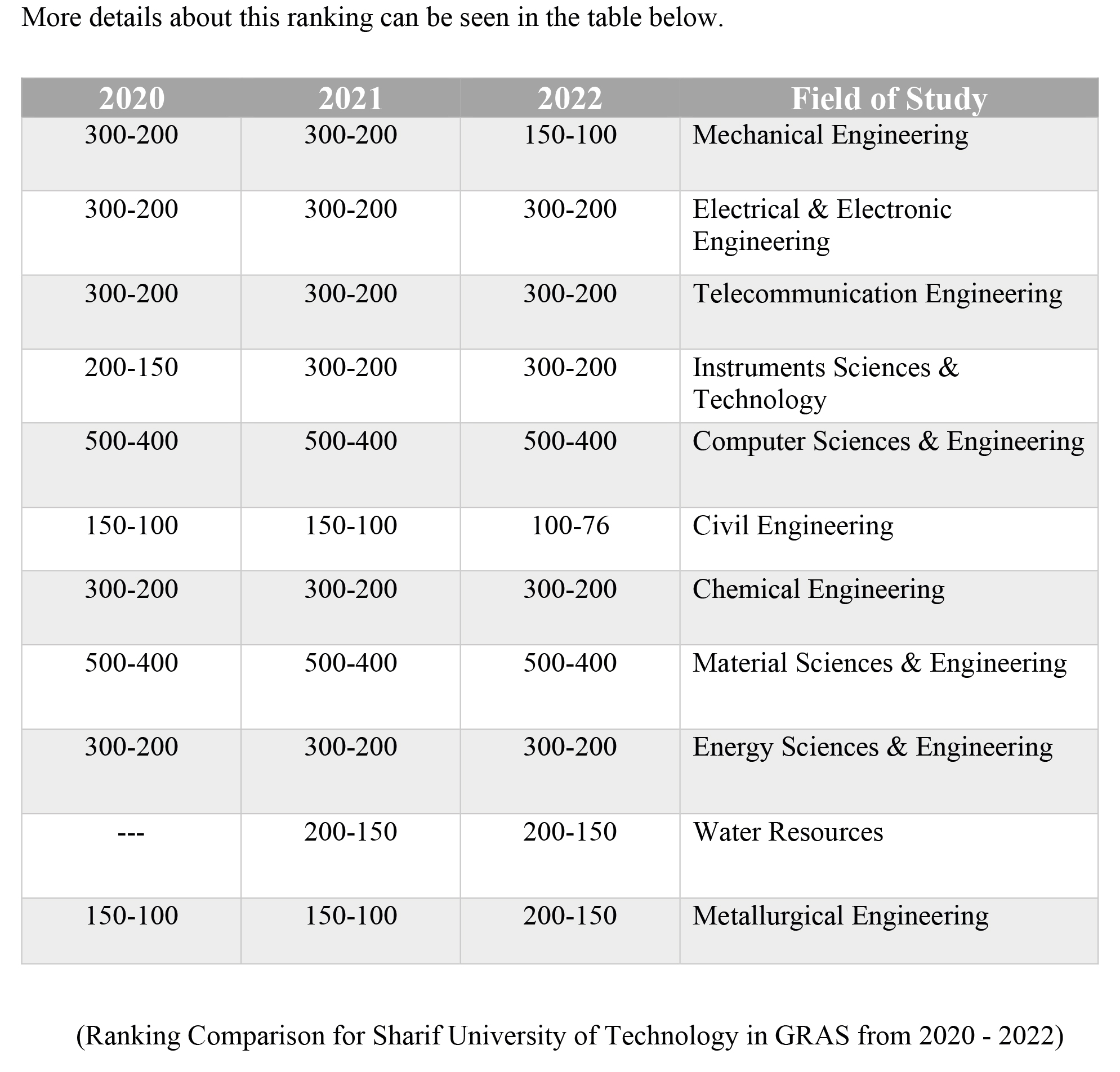 Sharif University of Technology is ranked in 11 Engineering fields this year with best performance in Civil Engineering, and the university's global ranking in this field is 76-100. Other fields include Mechanical Engineering, Electrical Engineering, Chemical Engineering, etc.