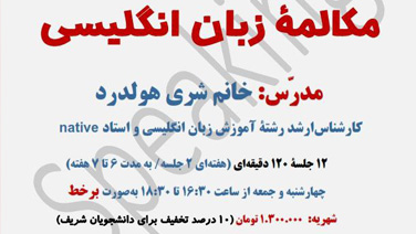 Speaking دوره مکالمه زبان انگلیسی ظرفیت تکمیل شد مکالمهٔ زبان انگلیسی (Speaking) استاد: شری هولدرد (استاد انگلیسیزبان، کارشناسارشد آموزش زبان انگلیسی) طول دوره: ۶ تا ۷ هفته، ۱۲ جلسهٔ ۱۲۰...