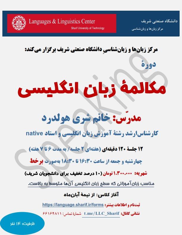 توضیحات: هدف از برگزاری این دوره تقویت سطح مکالمهٔ زبان‌آموزان، در تعامل با یک مدرس native است. این دوره برای زبان‌آموزانی مناسب است که سطح زبان آن‌ها متوسط به بالاست.